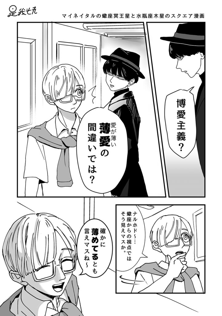 冥王星と木星「愛について」/2023 2024 10/27 マンガ ネイタル擬人化 2024年7月2日2024年10月27日 冥王星蠍座の蠍一と、木星水瓶座のJ・アクエリーナの90度スクエア漫画です! この投稿はツイッターでも結構ウケましたね。愛の種類についてはみんな思うところがあったようです。 マンガ ネイタル擬人化 90度 スクエア ネイタル擬人化 冥王星 博愛 天体擬人化 木星 水瓶座 蠍座 よかったらシェアしてね! 関連記事 ピスタチオ漫画/2021 2024年10月25日 火星と水星「天体の熱冷乾湿」/2022 2024年7月3日 「ホロ視え男を作った乙陽」(メタ的なネタ)/2024 2024年7月3日 ホロスコープが視える男と占い師_第2話/2024 2024年7月3日 ホロスコープが視える男と占い師_第1話/2024 2024年7月3日 破天荒イマジネーション3室/2024 2024年7月3日 T天王星と土星「職務放棄した土星」/2023 2024年7月3日 ヨルノ先生の鑑定レポ漫画/2022 2024年7月2日